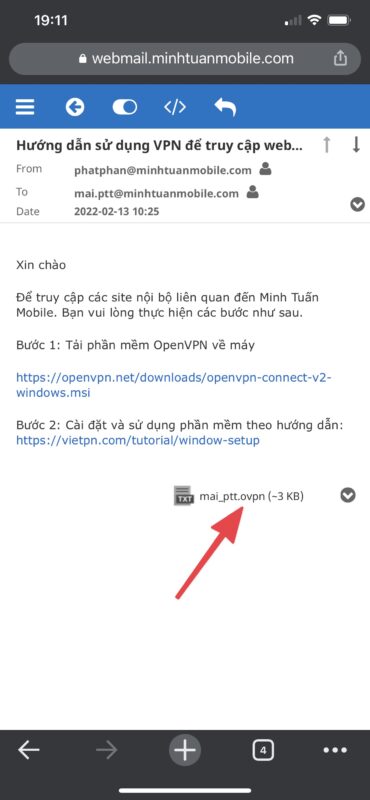 Hướng dẫn Hướng dẫn cài đặt và sử dụng VPN trên iPhone Bước 1: Tìm kiếm và cài đặt ứng dụng OpenVPN Bước 2: Truy cập webmail, đăng nhập tài khoản đã được cung cấp và tải file *.ovpn Bước 3: Truy cập ứng dụng “Tệp” trên iPhone > Chọn mục Trên iPhone > Tải về > Click vào file .ovpn vừa mới tải về